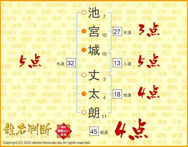 池(7画)宮(10画)城(10画) 丈(3画)太(4画)朗(11画)