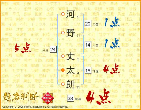 河(9画)野(11画) 丈(3画)太(4画)朗(11画)