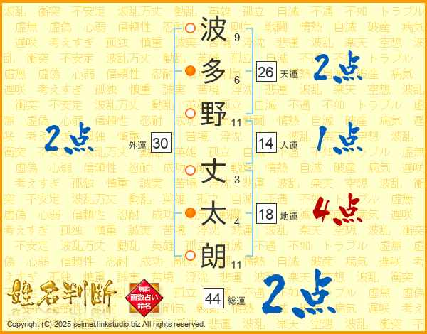 波(9画)多(6画)野(11画) 丈(3画)太(4画)朗(11画)