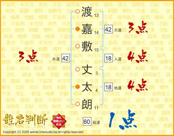 渡(13画)嘉(14画)敷(15画) 丈(3画)太(4画)朗(11画)