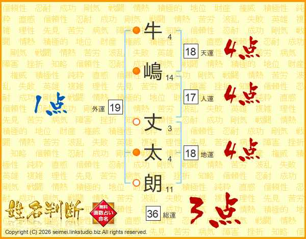 牛(4画)嶋(14画) 丈(3画)太(4画)朗(11画)