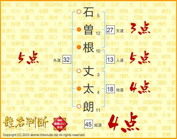 石(5画)曽(12画)根(10画) 丈(3画)太(4画)朗(11画)