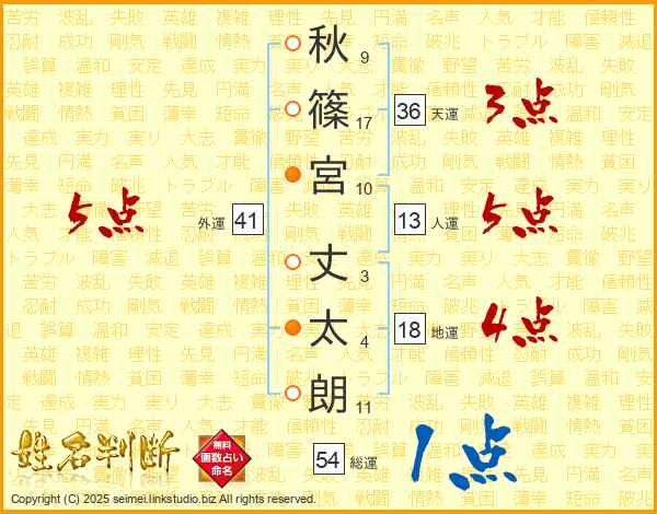 秋(9画)篠(17画)宮(10画) 丈(3画)太(4画)朗(11画)