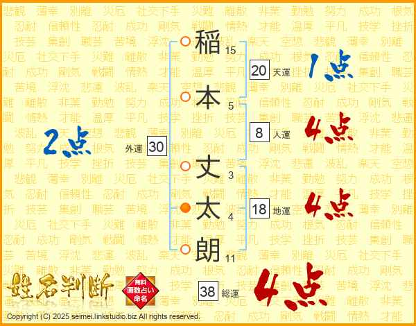 稲(15画)本(5画) 丈(3画)太(4画)朗(11画)
