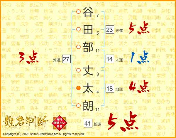 谷(7画)田(5画)部(11画) 丈(3画)太(4画)朗(11画)