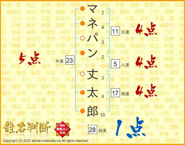 マ(2画)ネ(4画)パ(3画)ン(2画) 丈(3画)太(4画)郎(10画)