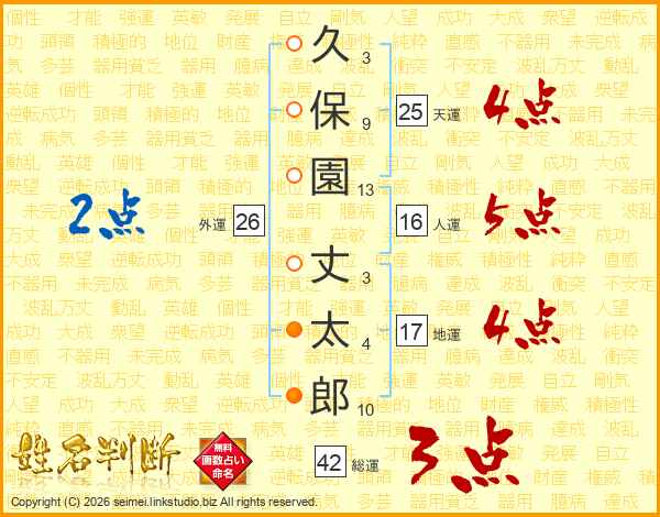 久(3画)保(9画)園(13画) 丈(3画)太(4画)郎(10画)