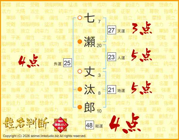 七(7画)瀬(20画) 丈(3画)汰(8画)郎(10画)