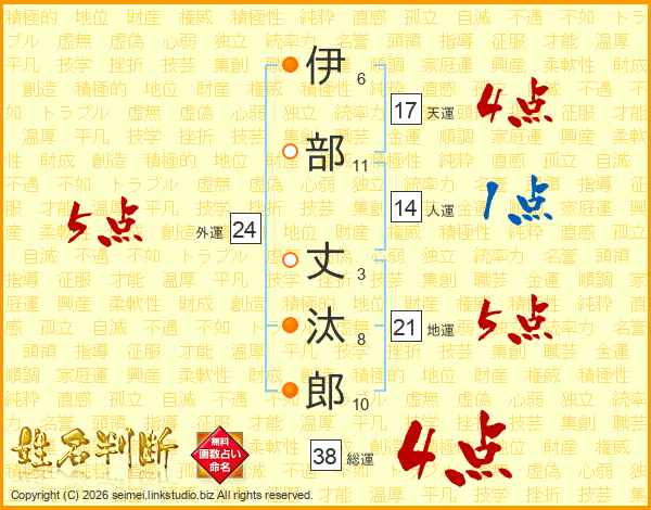伊(6画)部(11画) 丈(3画)汰(8画)郎(10画)