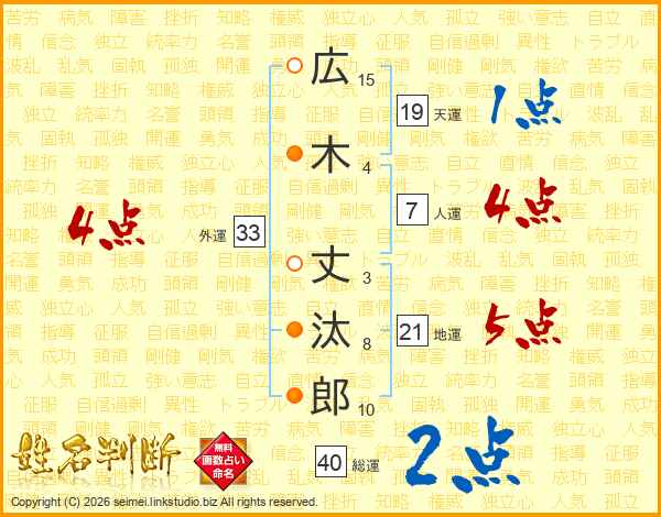 広(15画)木(4画) 丈(3画)汰(8画)郎(10画)