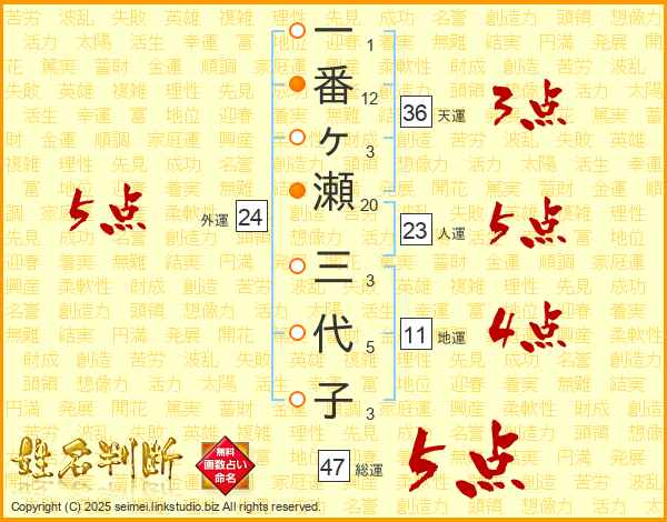 一番ヶ瀬三代子さんの外運は24画の5点!