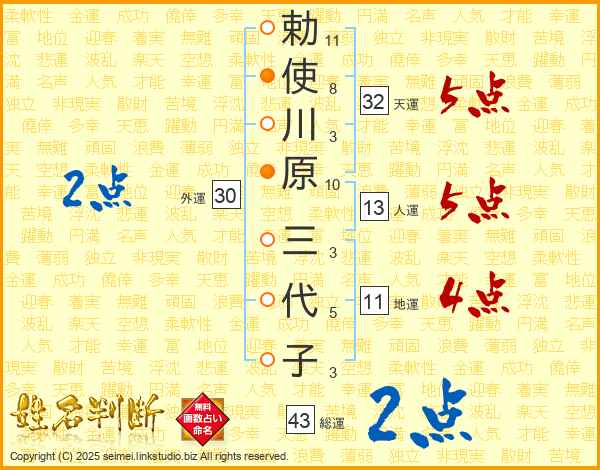 勅使川原三代子さんの総運は43画の2点!