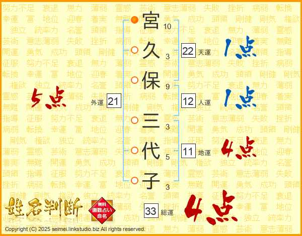 宮(10画)久(3画)保(9画) 三(3画)代(5画)子(3画)