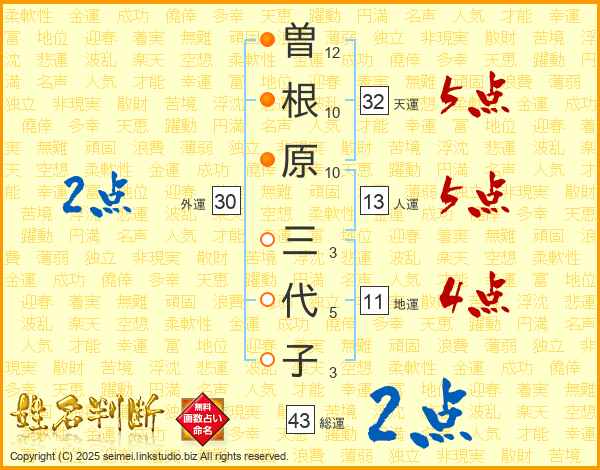 曽根原三代子さんの天運は32画の5点!