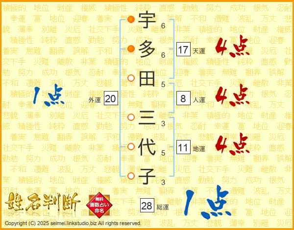 宇(6画)多(6画)田(5画) 三(3画)代(5画)子(3画)