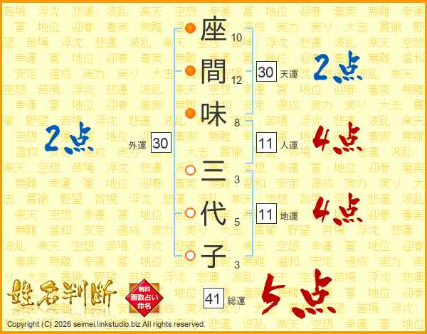 座間味三代子さんの総運は41画の5点!