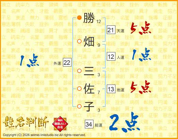 勝(12画)畑(9画) 三(3画)佐(7画)子(3画)
