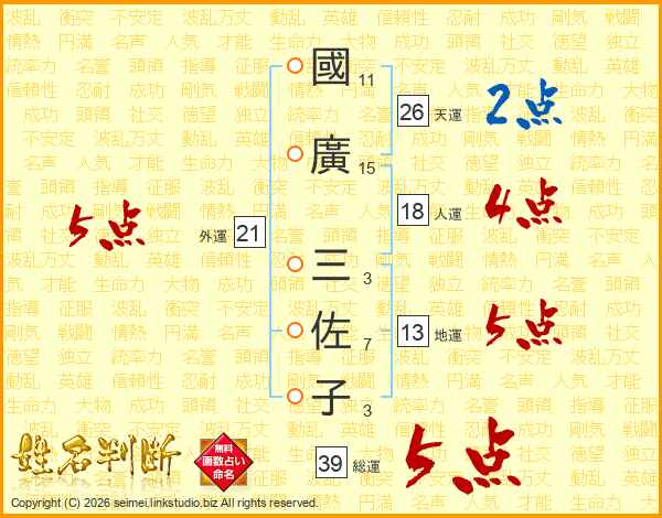 國(11画)廣(15画) 三(3画)佐(7画)子(3画)