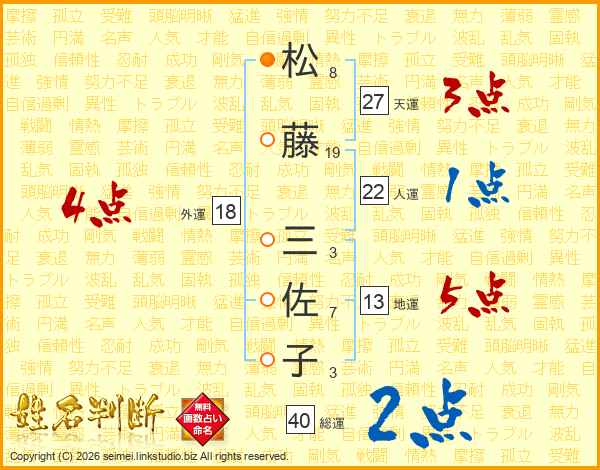 松(8画)藤(19画) 三(3画)佐(7画)子(3画)