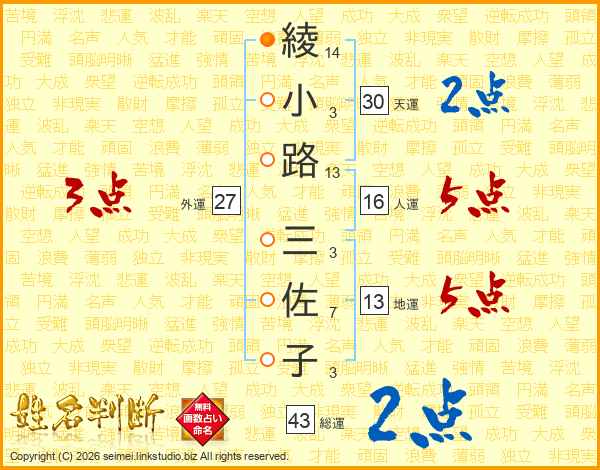 綾(14画)小(3画)路(13画) 三(3画)佐(7画)子(3画)