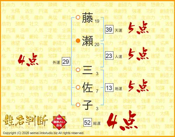 藤瀬三佐子さんの総運は52画の4点!