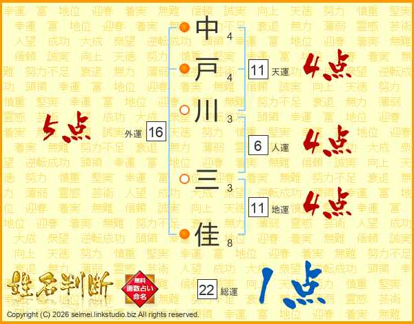 生活面を象徴する運勢です。外部から受ける影響力を表し、結婚運、家庭運や職場、環境への順応性を表します。総運から人運を引いた画数。姓や名が1文字の場合を除く。