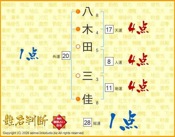 八(8画)木(4画)田(5画) 三(3画)佳(8画)