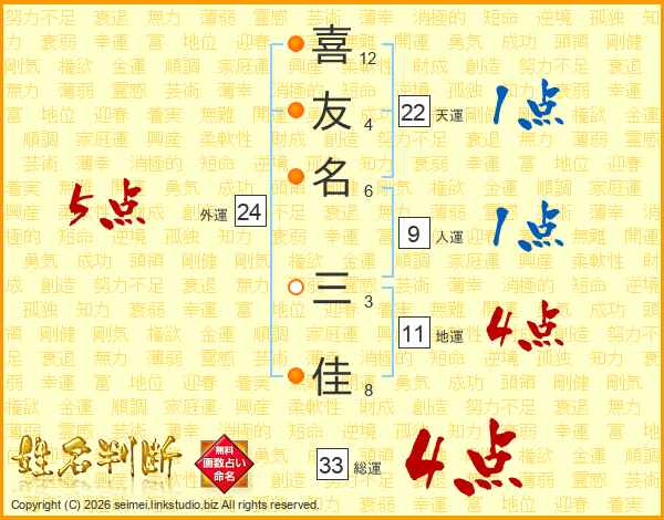 喜(12画)友(4画)名(6画) 三(3画)佳(8画)
