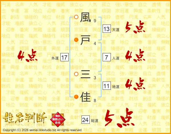 風(9画)戸(4画) 三(3画)佳(8画)