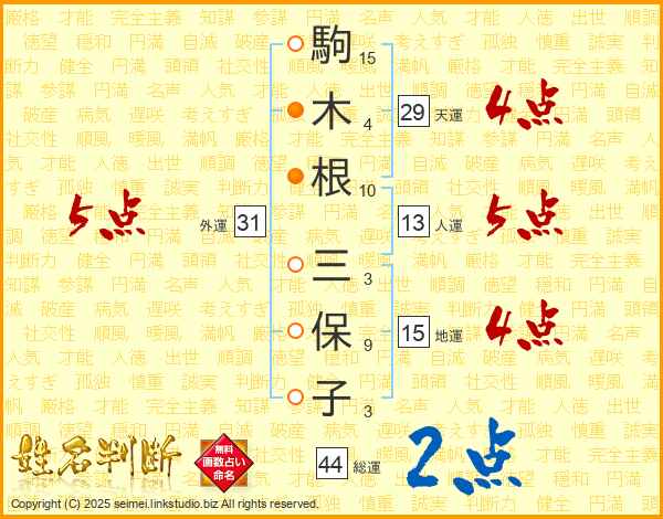 駒(15画)木(4画)根(10画) 三(3画)保(9画)子(3画)