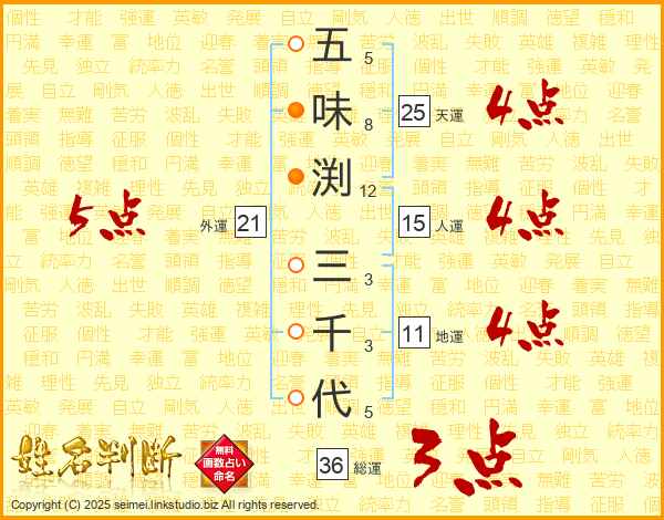 五(5画)味(8画)渕(12画) 三(3画)千(3画)代(5画)