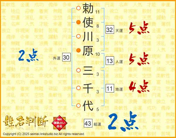 勅(11画)使(8画)川(3画)原(10画) 三(3画)千(3画)代(5画)