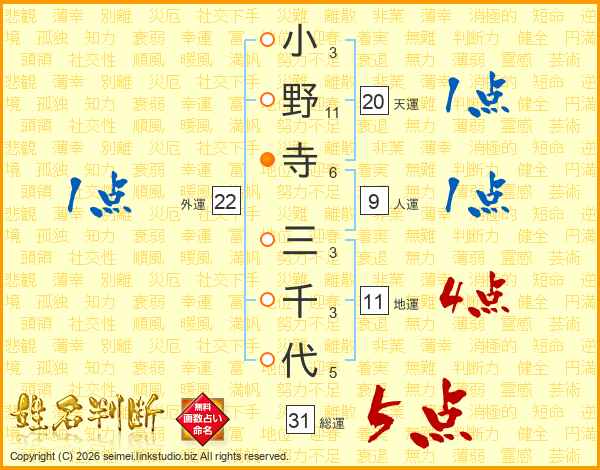 小(3画)野(11画)寺(6画) 三(3画)千(3画)代(5画)