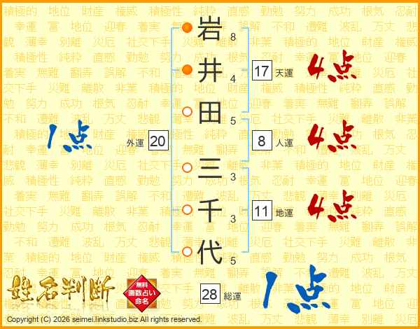 岩(8画)井(4画)田(5画) 三(3画)千(3画)代(5画)