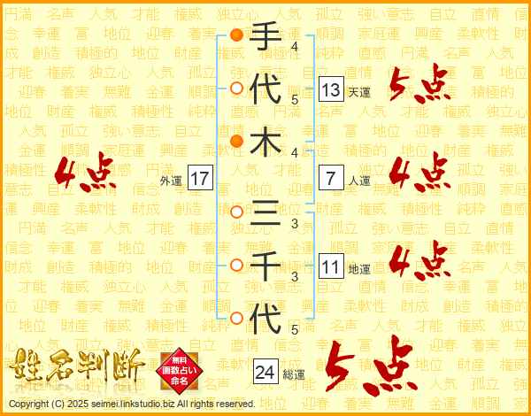 手(4画)代(5画)木(4画) 三(3画)千(3画)代(5画)