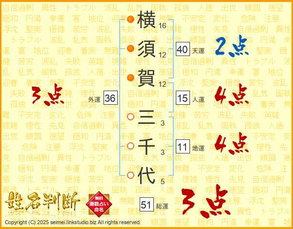 横(16画)須(12画)賀(12画) 三(3画)千(3画)代(5画)