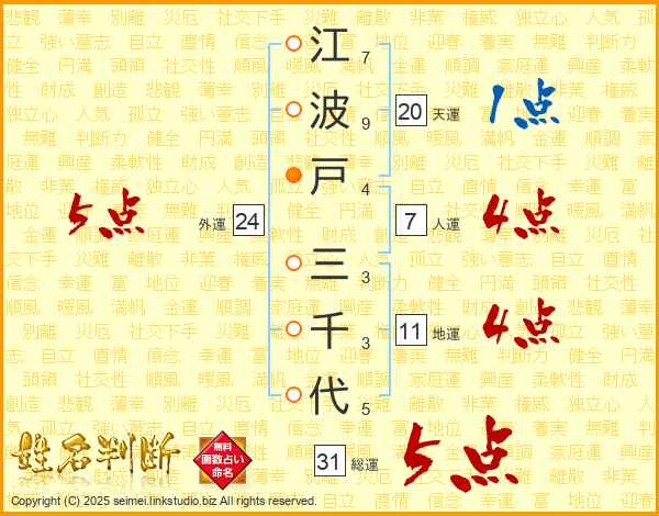 江(7画)波(9画)戸(4画) 三(3画)千(3画)代(5画)