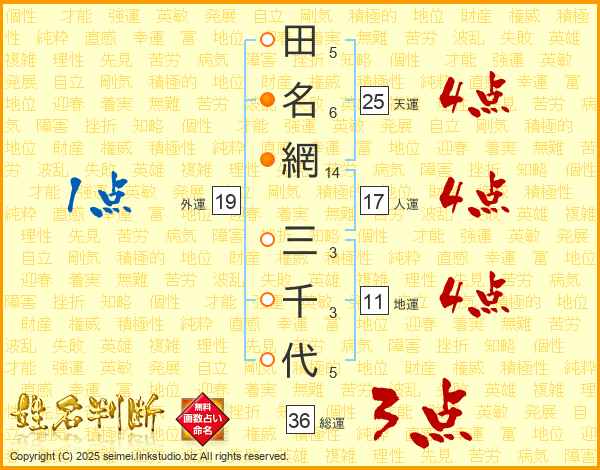 田(5画)名(6画)網(14画) 三(3画)千(3画)代(5画)