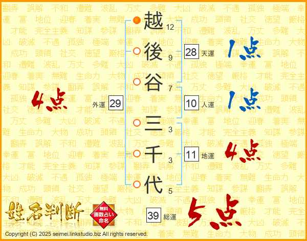 越(12画)後(9画)谷(7画) 三(3画)千(3画)代(5画)