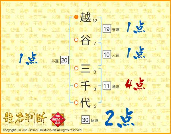 生活面を象徴する運勢です。外部から受ける影響力を表し、結婚運、家庭運や職場、環境への順応性を表します。総運から人運を引いた画数。姓や名が1文字の場合を除く。