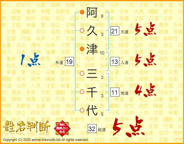 阿(8画)久(3画)津(10画) 三(3画)千(3画)代(5画)