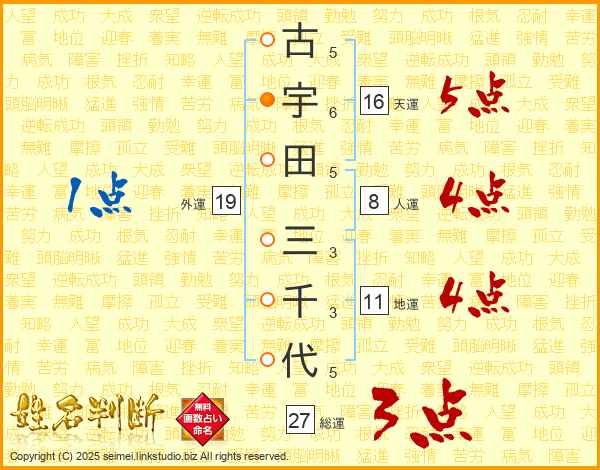 古(5画)宇(6画)田(5画) 三(3画)千(3画)代(5画)