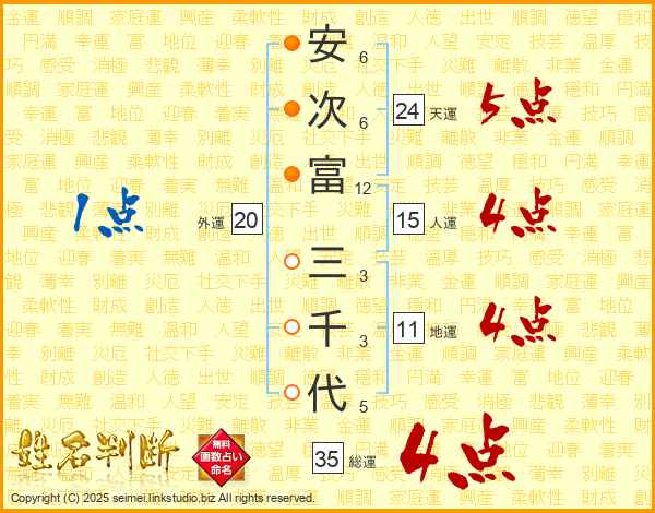 安(6画)次(6画)富(12画) 三(3画)千(3画)代(5画)