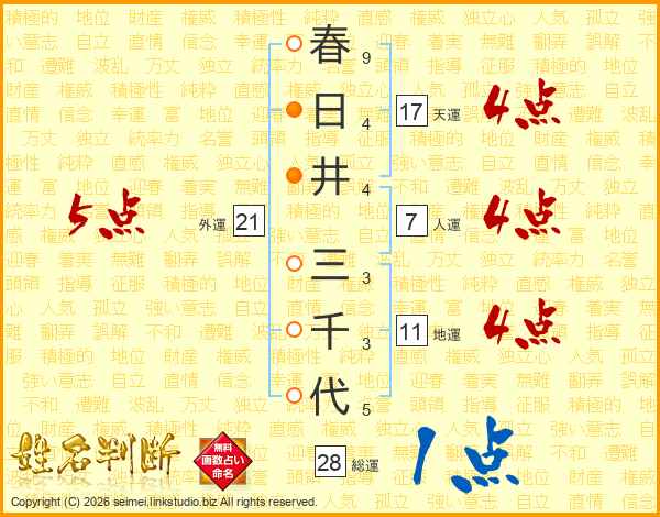 春(9画)日(4画)井(4画) 三(3画)千(3画)代(5画)