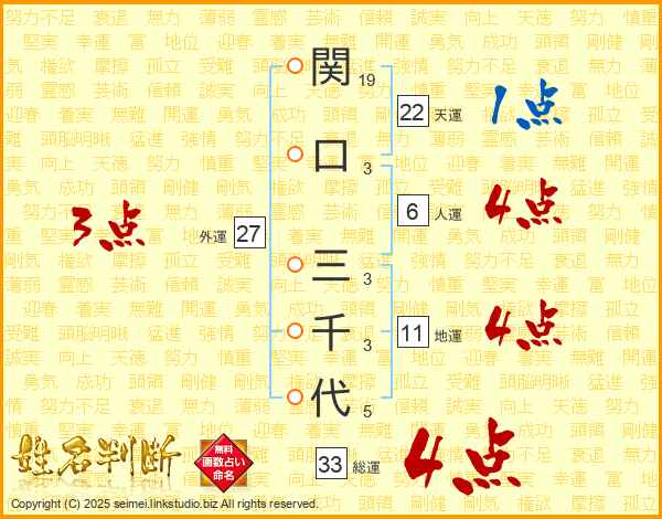 関(19画)口(3画) 三(3画)千(3画)代(5画)