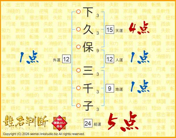下(3画)久(3画)保(9画) 三(3画)千(3画)子(3画)