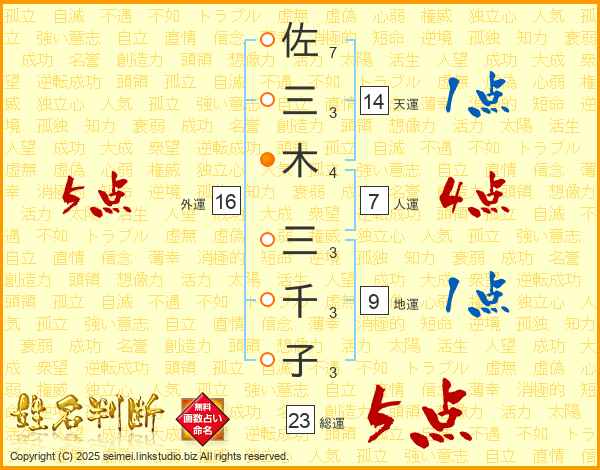 佐(7画)三(3画)木(4画) 三(3画)千(3画)子(3画)