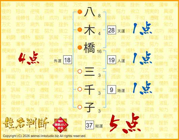 八(8画)木(4画)橋(16画) 三(3画)千(3画)子(3画)