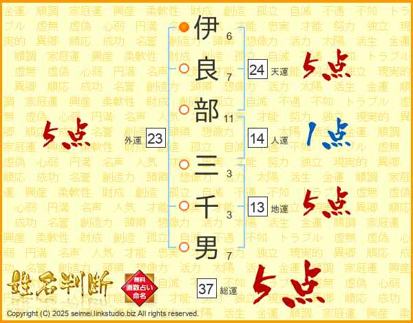 伊(6画)良(7画)部(11画) 三(3画)千(3画)男(7画)