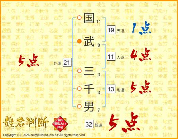 国(11画)武(8画) 三(3画)千(3画)男(7画)